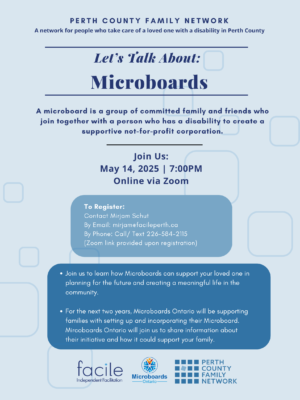 Facile Futures is excited to support the Perth County Family Network to offer a virtual meet-up around the topic of Microboards. Mirjam Schut, a facilitator with Facile Futures, will facilitate conversations with families who attend. Karen Bell, the Executive Director of Microboards Ontario, will also be there to present information about a new project that can support families to incorporate and to answer questions you might have.